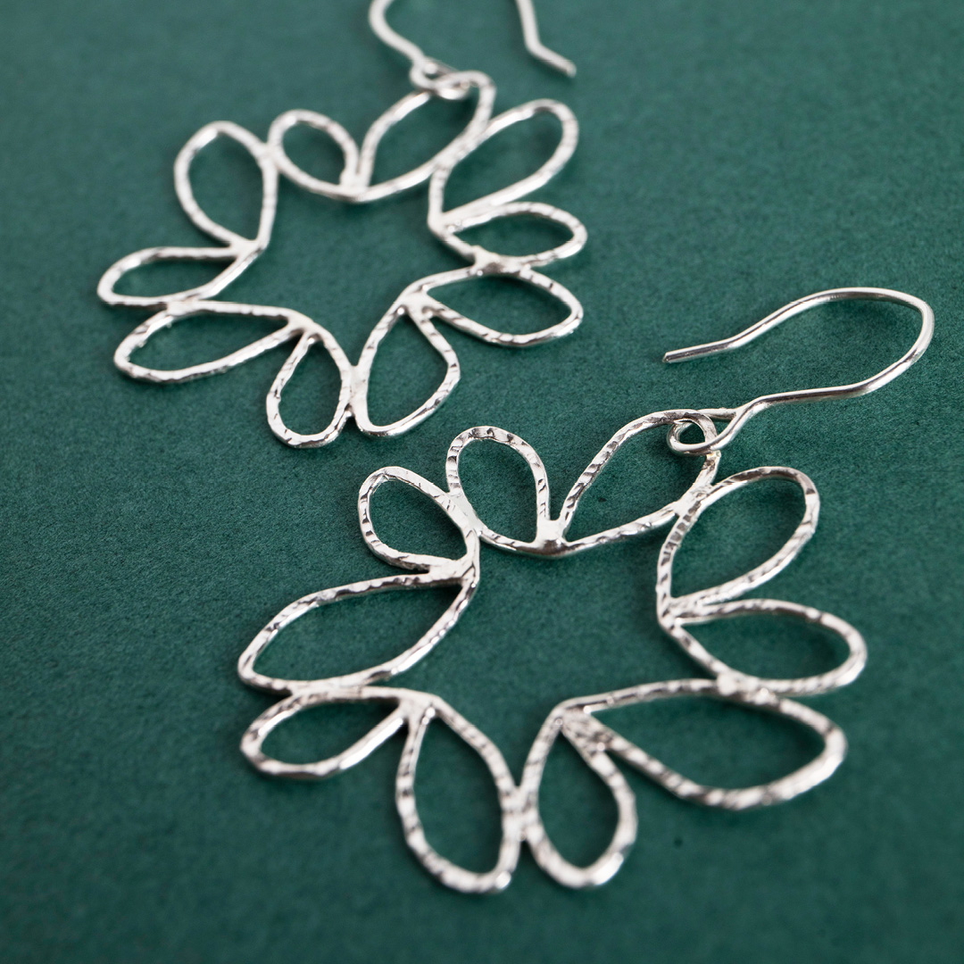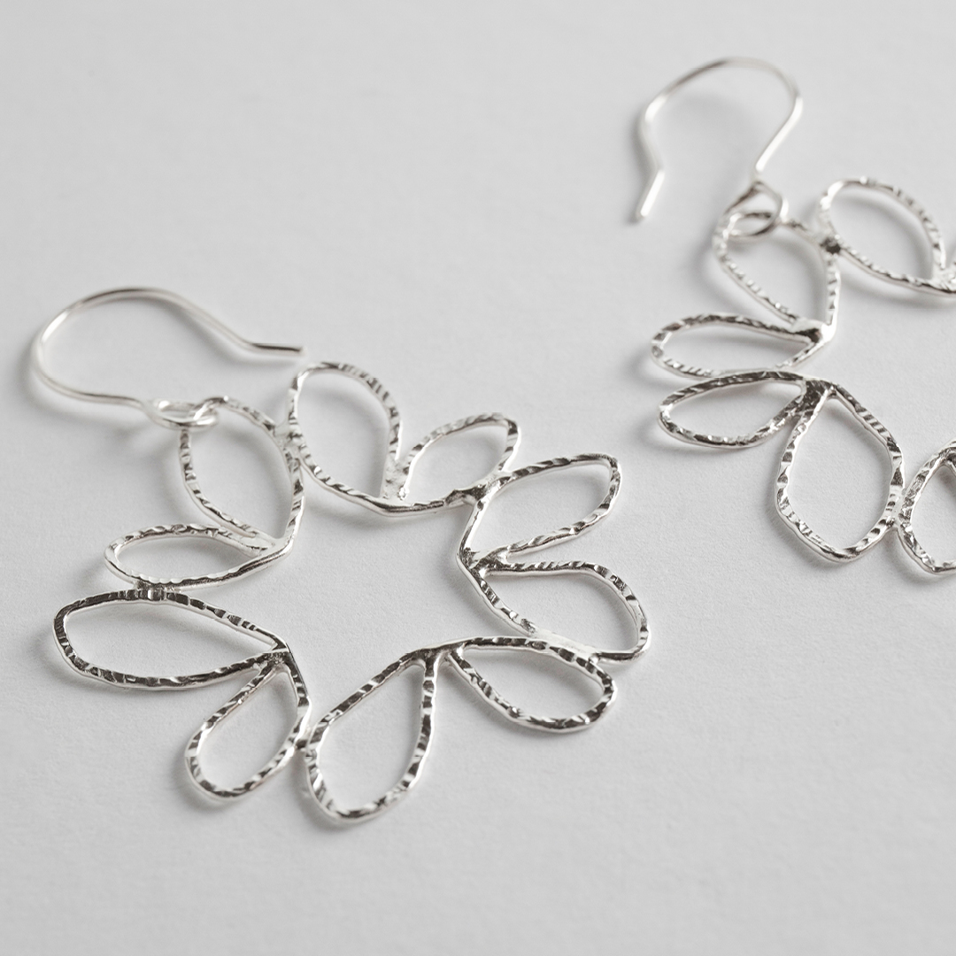 ELISA OLI explores the repetition of an organic form through a light, open composition. A sequence of elongated leaves creates a sculptural shape that remains airy, refined, and highly wearable. Airy, elegant, and expressive.