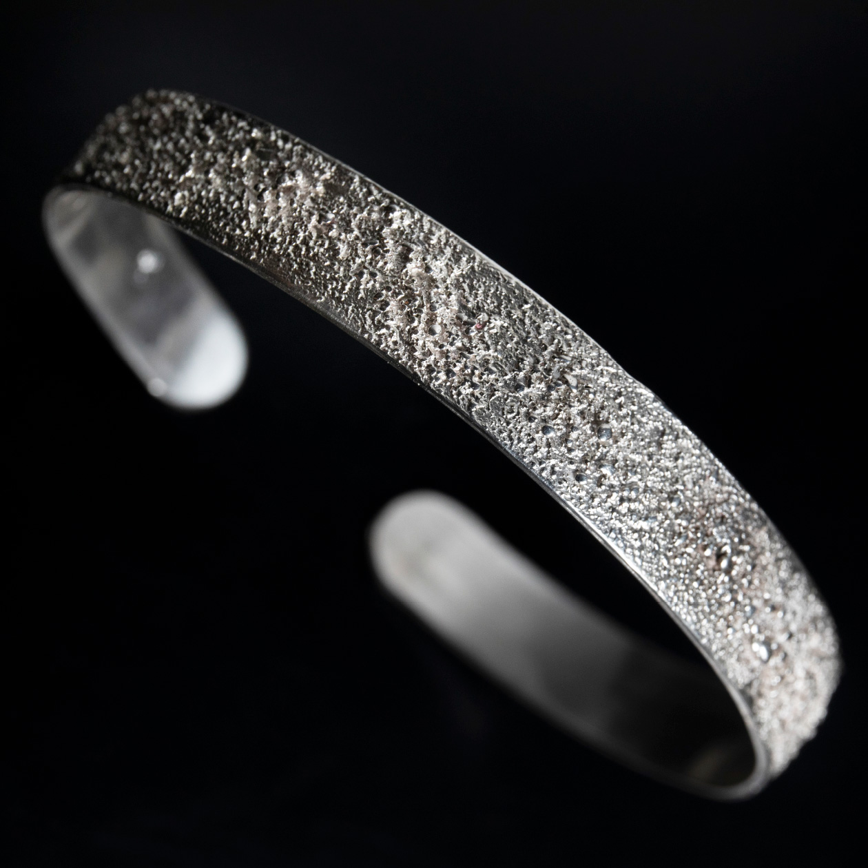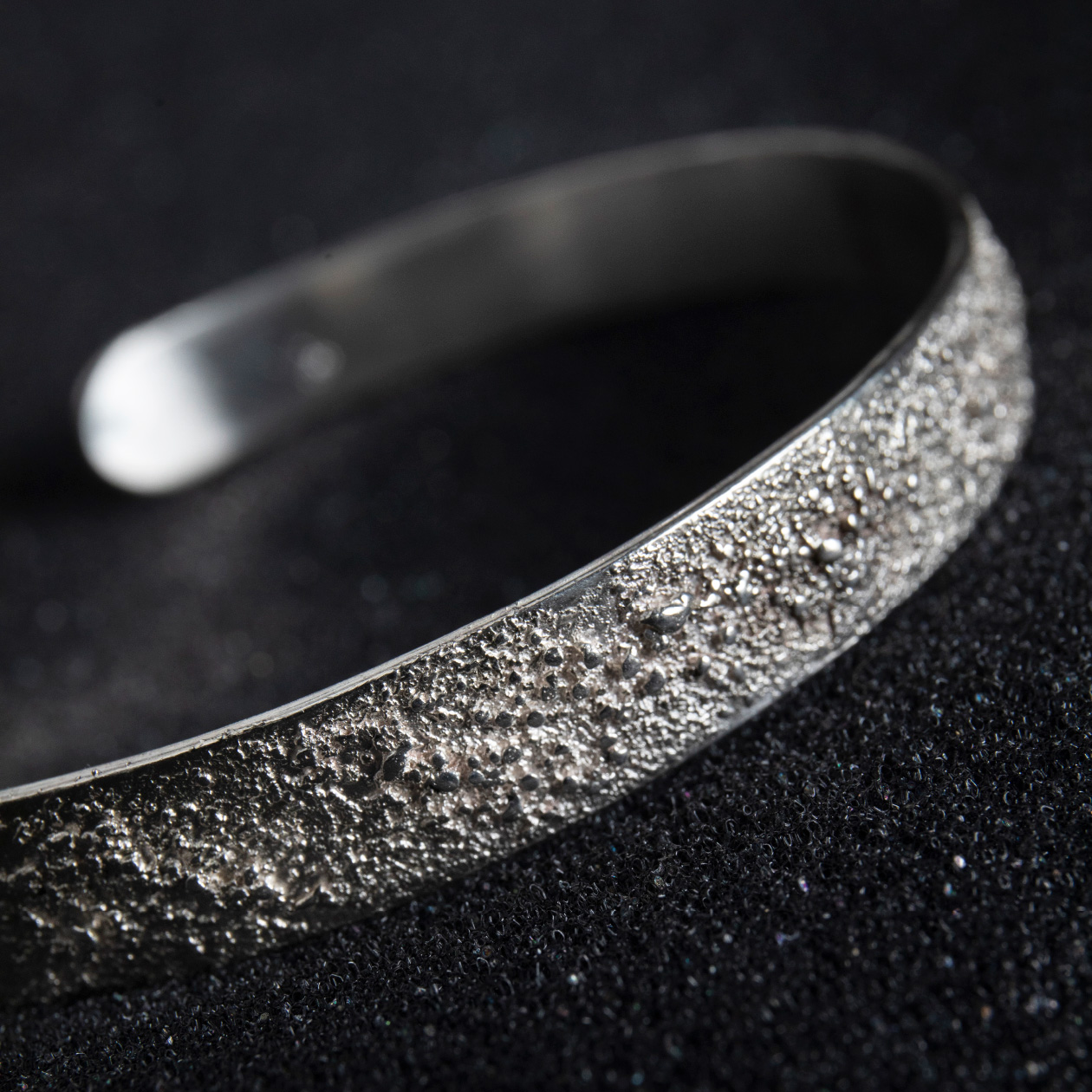 The combination of a simple geometric shape and a subtle texture makes this bracelet a unique fashion accessory. Due to the open shape, the size is adjustable.