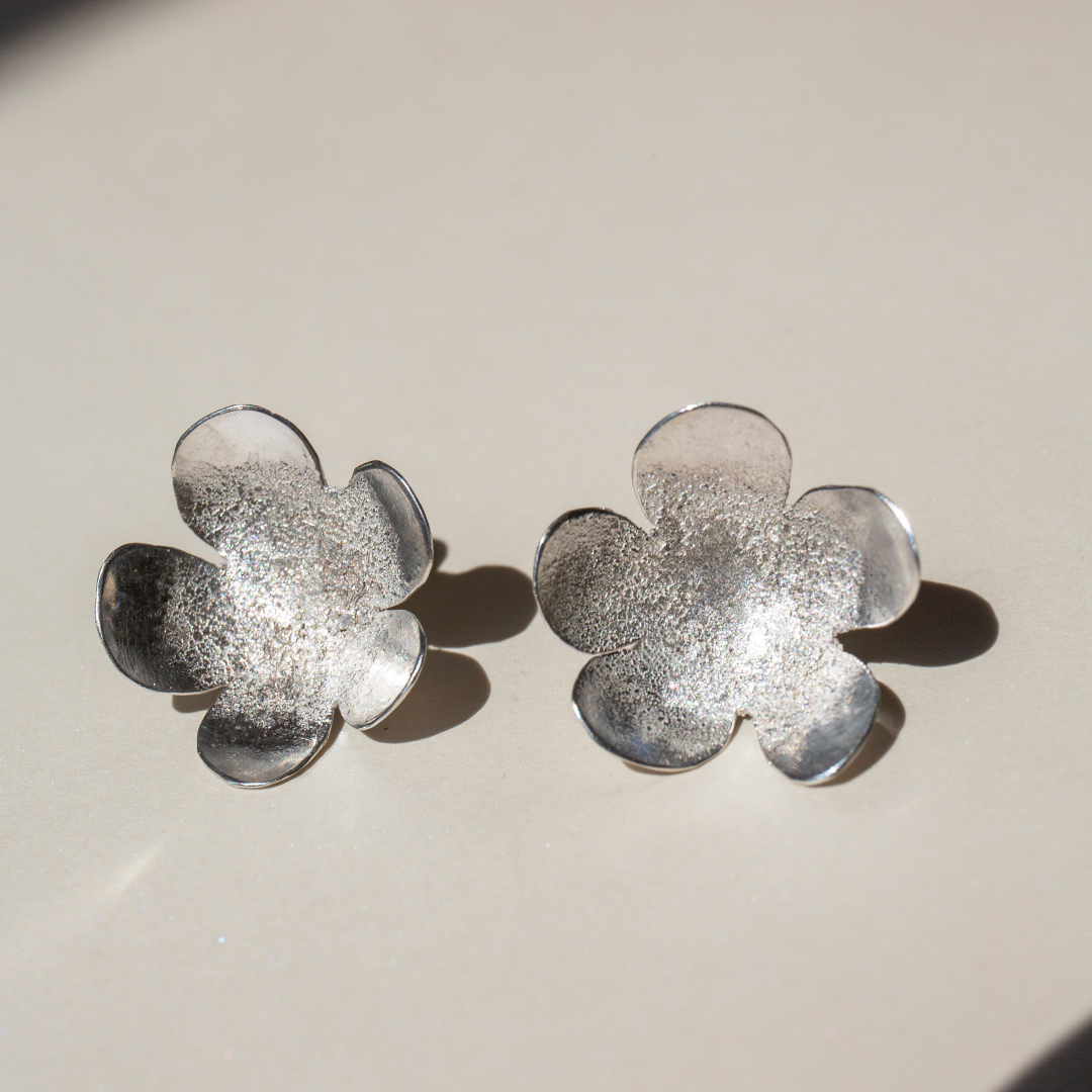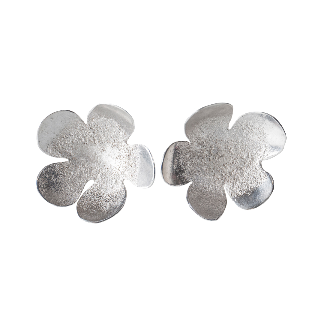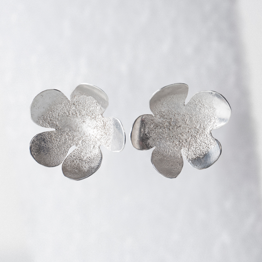 Silver flower-inspired earrings with a gently curved profile that follows the face. A contrast of matte and textured surfaces gives a refined, contemporary character. Statement yet easy to wear.