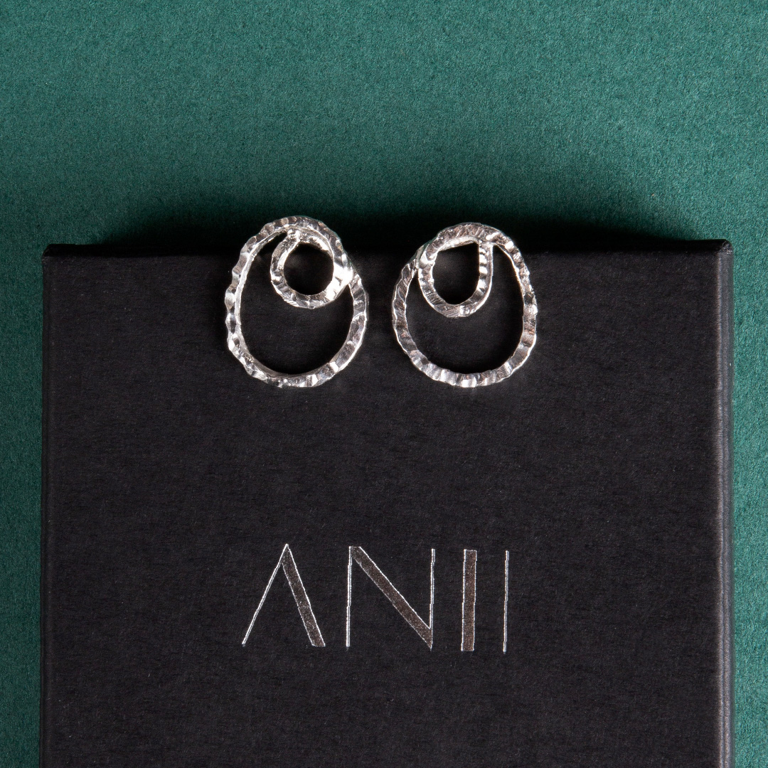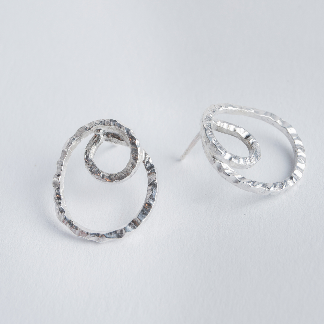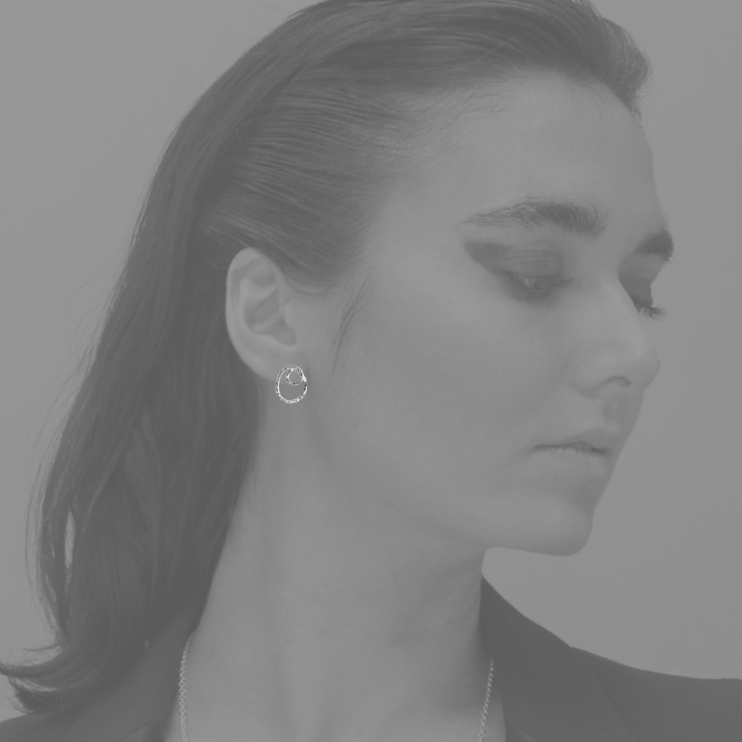 LAP earrings look like a line drawing in silver. An irregular oval is traced by a line that turns back towards the centre and forms a soft spiral. The hand-hammered texture breaks up the surface and catches the light in small flashes as you move. Light, open and understated. For days when you want a simple piece that still has its own rhythm.