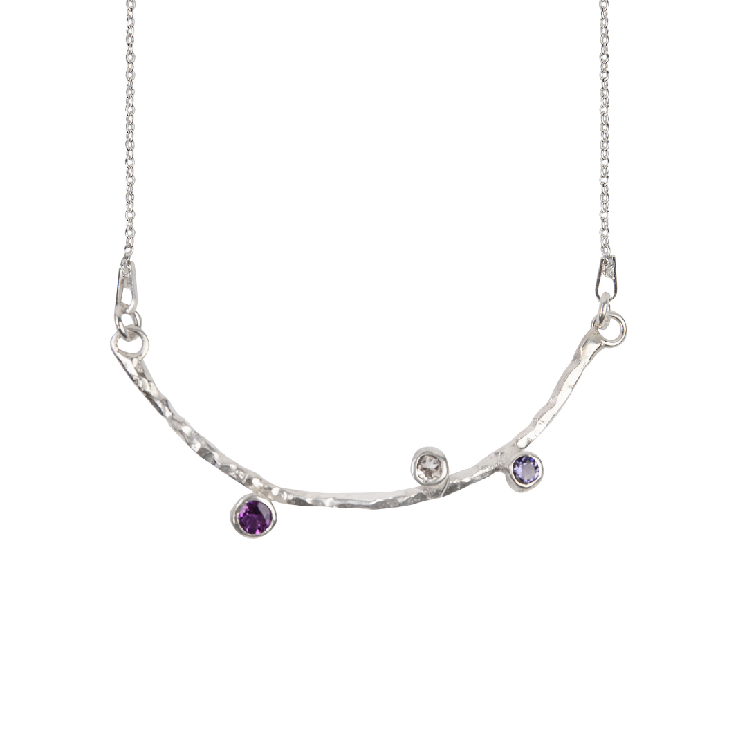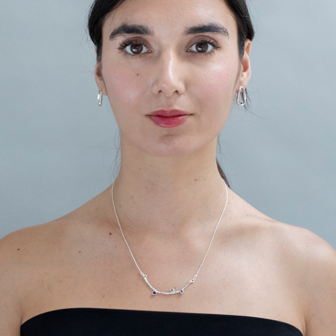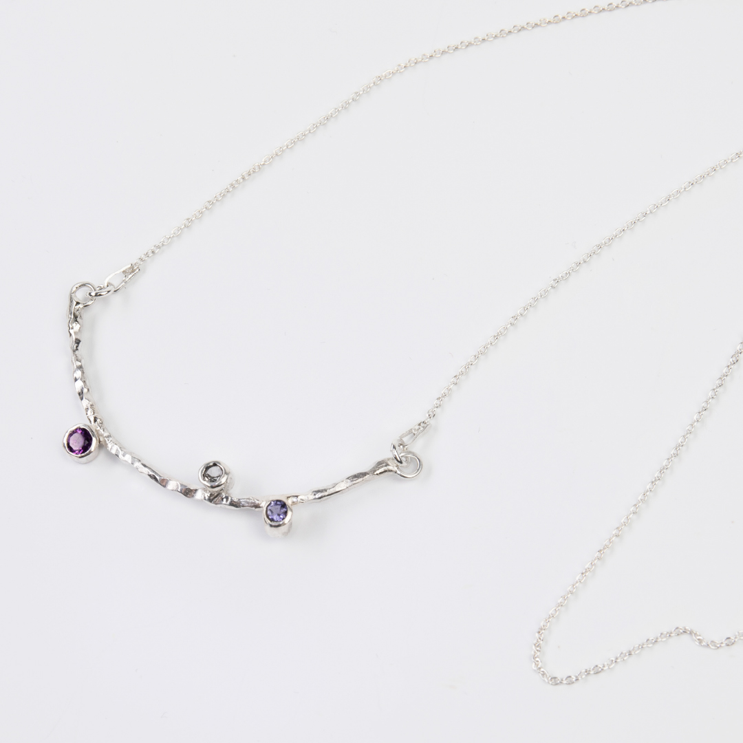 Ametist, bijeli topaz i iolit postavljeni su duž luka u nježno asimetričnom rasporedu. Tri kamena u suptilnoj asimetriji unose ritam svjetla i boje, stvarajući skladnu kompoziciju.