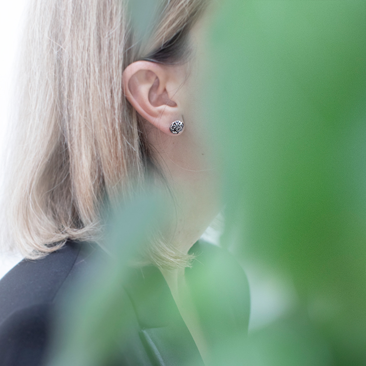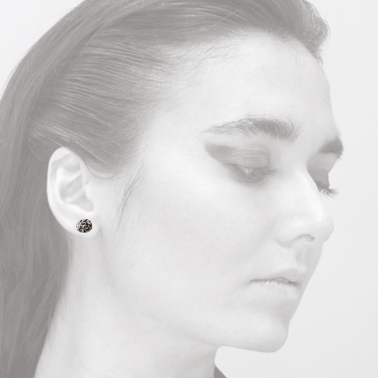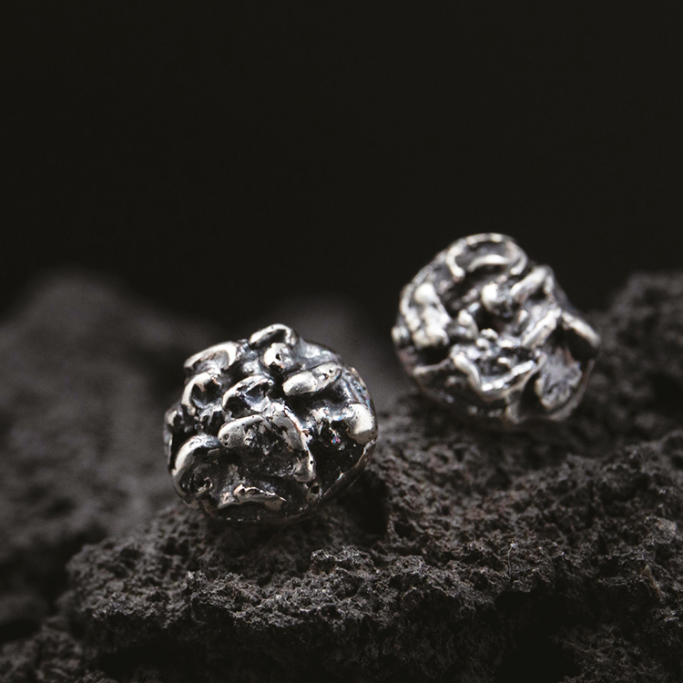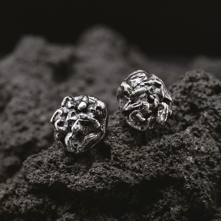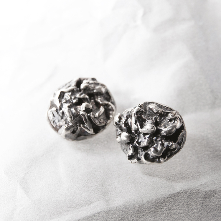 Naušnice organske teksture od patiniranog srebra malene su ali voluminozne i dojmljive.